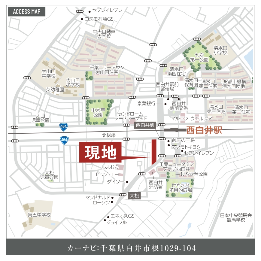 | 交通 | 北総線「西白井」駅 徒歩3~4分 北総線「白井」駅 徒歩27~28分 新京成線「鎌ヶ谷大仏」駅 バス20分 「大松入口」停歩3分 |